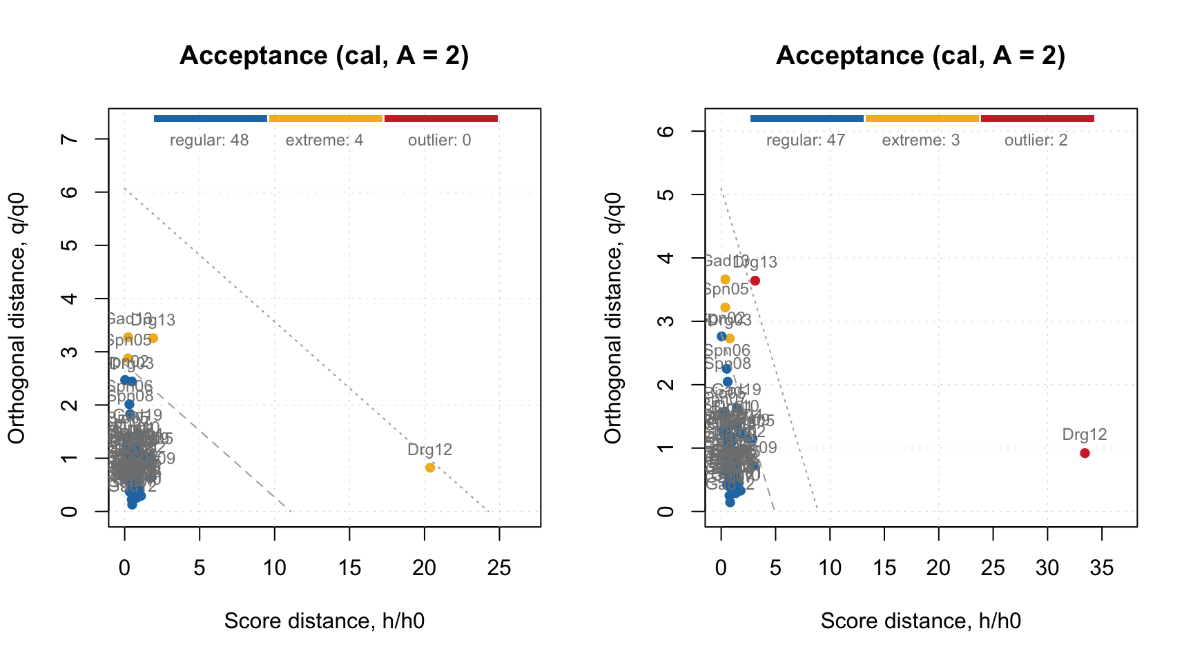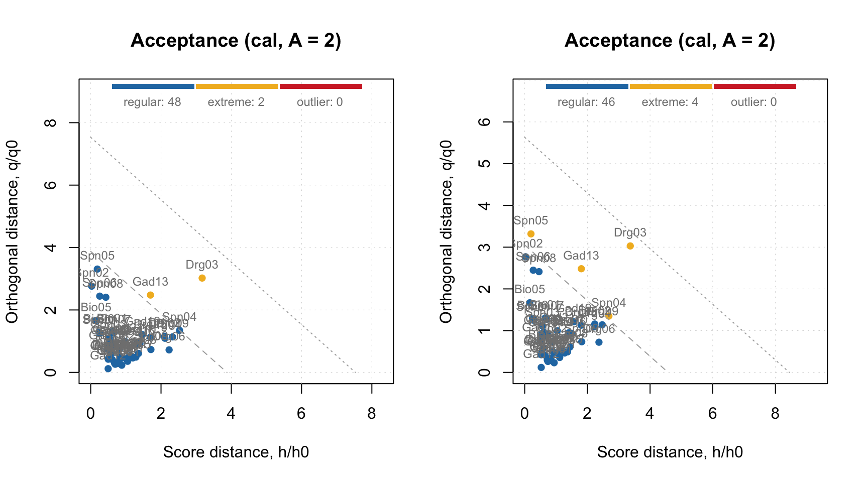 plotAcceptance(m, ncomp = 2, limType = "robust", show.labels = TRUE)