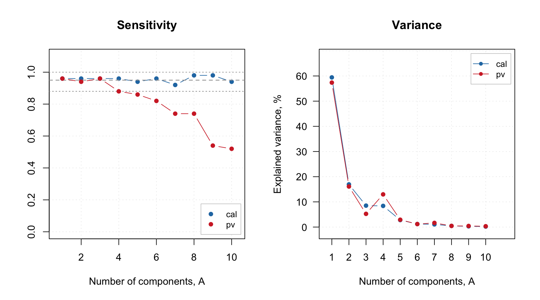 As one can see, the sensitivity for PV-set (red color) is within the interval for the first two PCs, and then falling apart. After \(A = 6\) the overfitting becomes obvious. The variance plot shows a large discrepancy between the individual variance values for training and PV-sets which possibly indicates the presence of outliers.