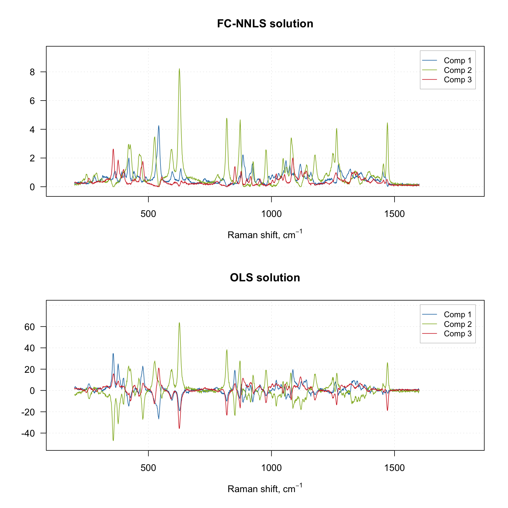 As you can see, the OLS solution without non-negativity constraint contains negative values. Once again, if you do not want to experiment with negative values, using the default option (FCNNLS) will be the best.