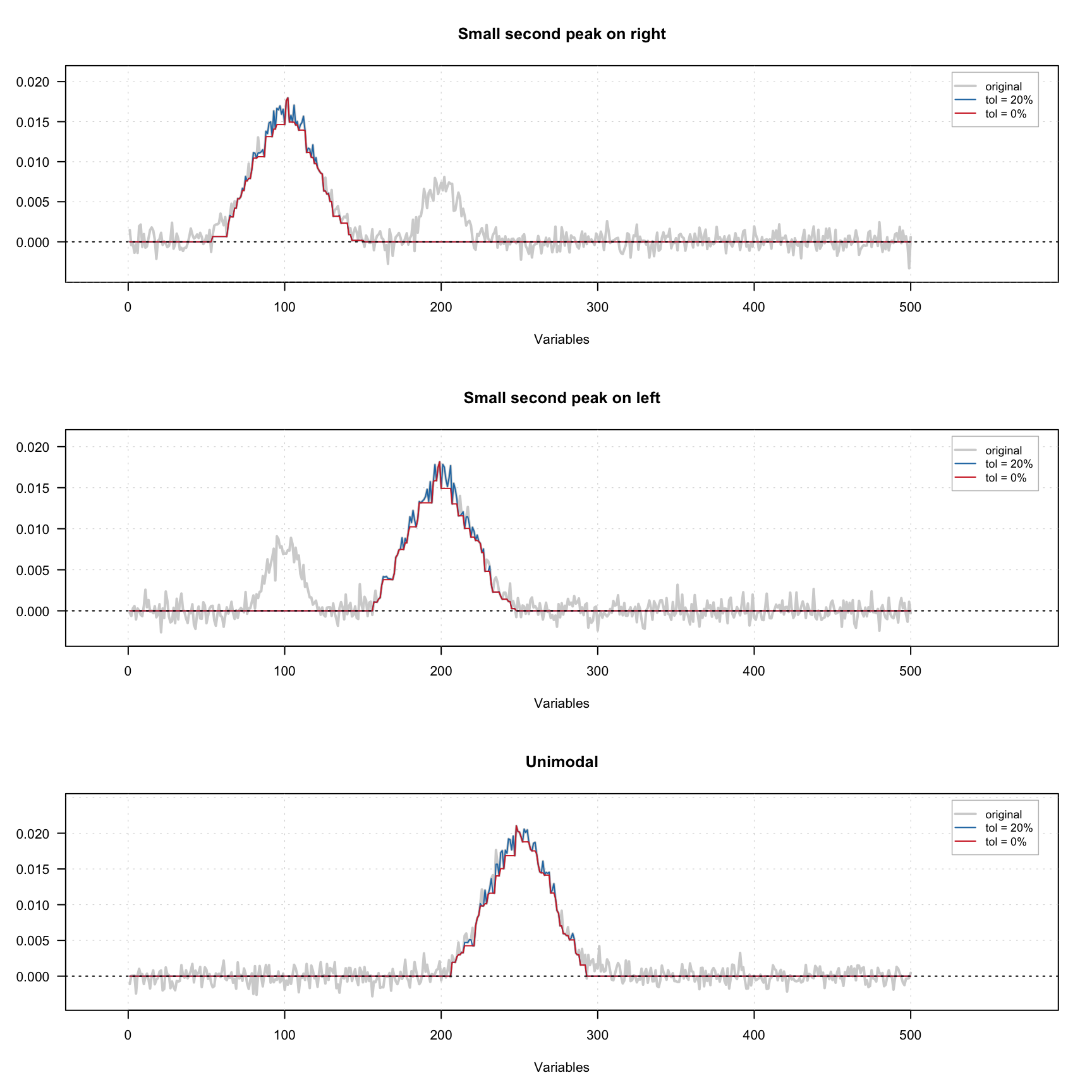 The figure below shows how the constraint works using three signals — one with small extra peak on the left, one with small extra peak on the right and one unimodal signal. A small amount of noise was added to all signals. There are one original signal (gray) and two constrained signals on the plot. The red one shows the result for 0% tolerance and the blue one shows the result for 20% tolerance.