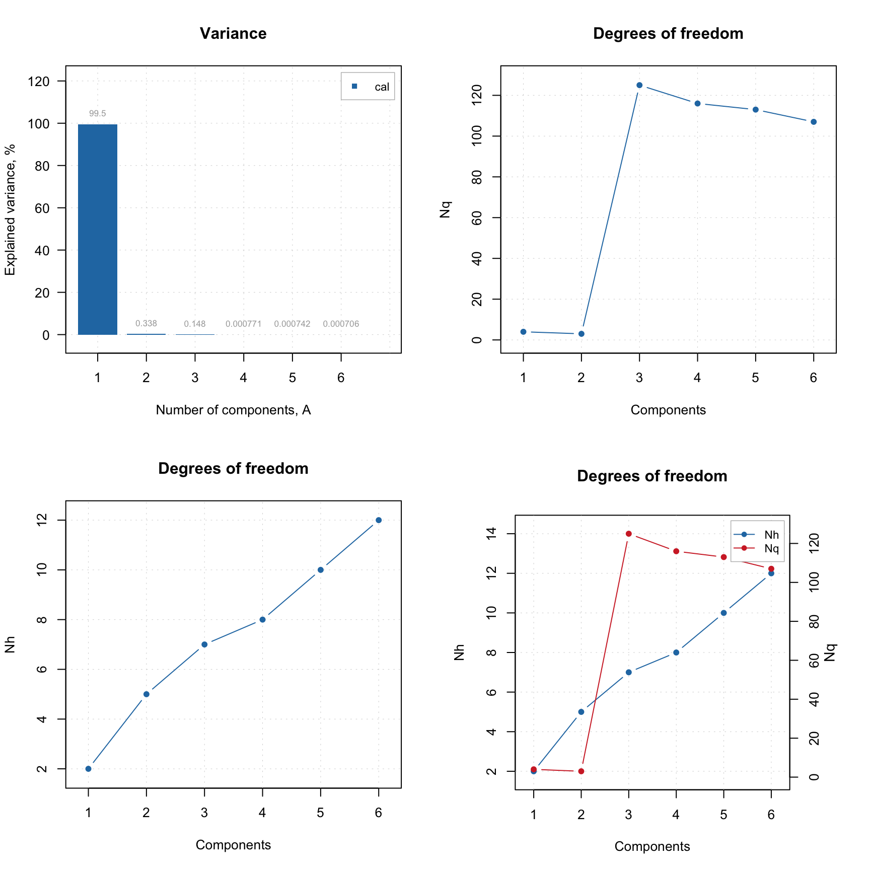 A simple plot, where the number of degrees of freedom is plotted against the number of components in PCA model can often reveal the presence of overfitting — the DoF value for the orthogonal distance, \(N_q\) jumps up significantly.