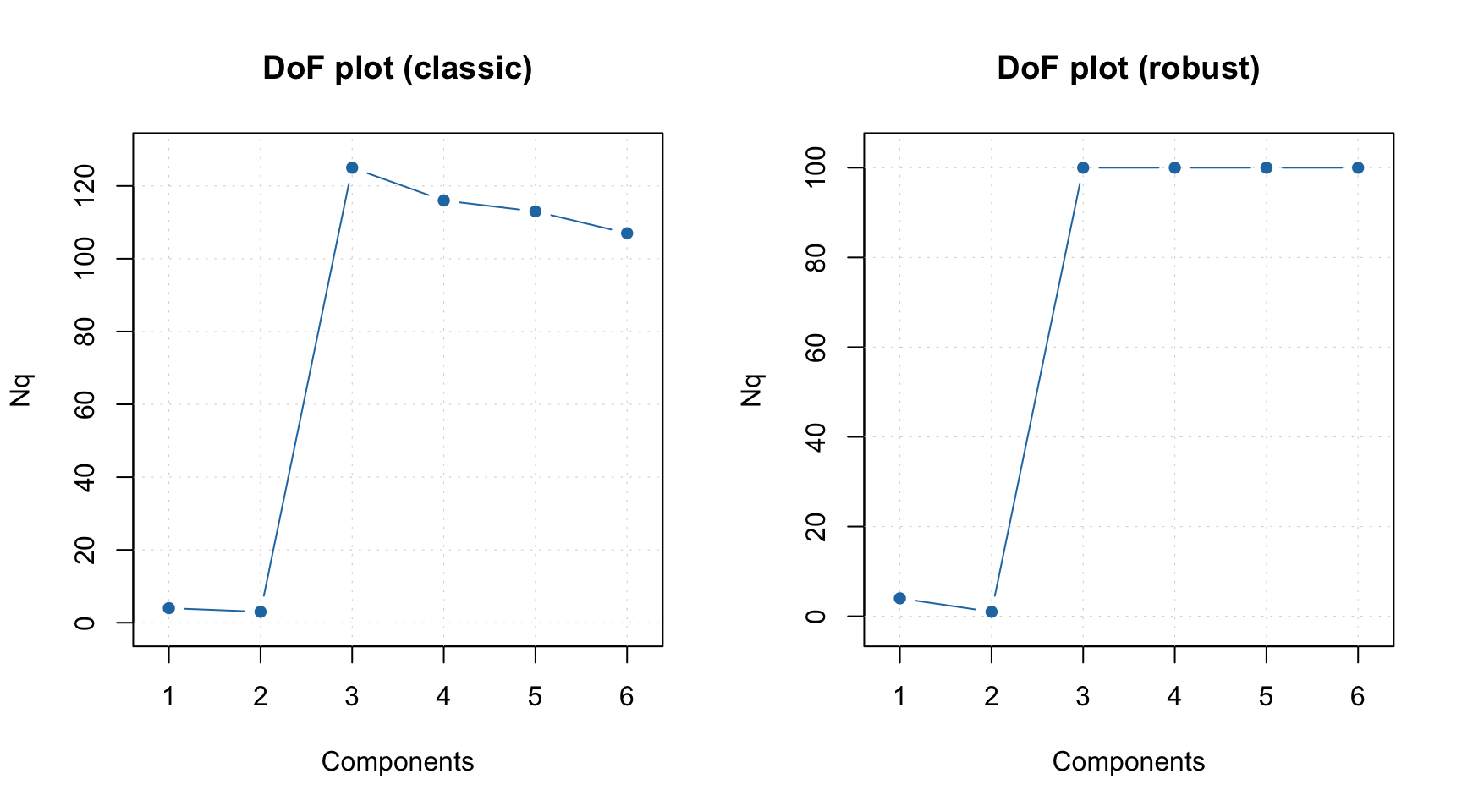 In this case both plots demonstrate quite similar behavior, however if they look different it can be an indicator of the presence of outliers. The DoF plots work only if a data-driven method is used for computing of critical limits.