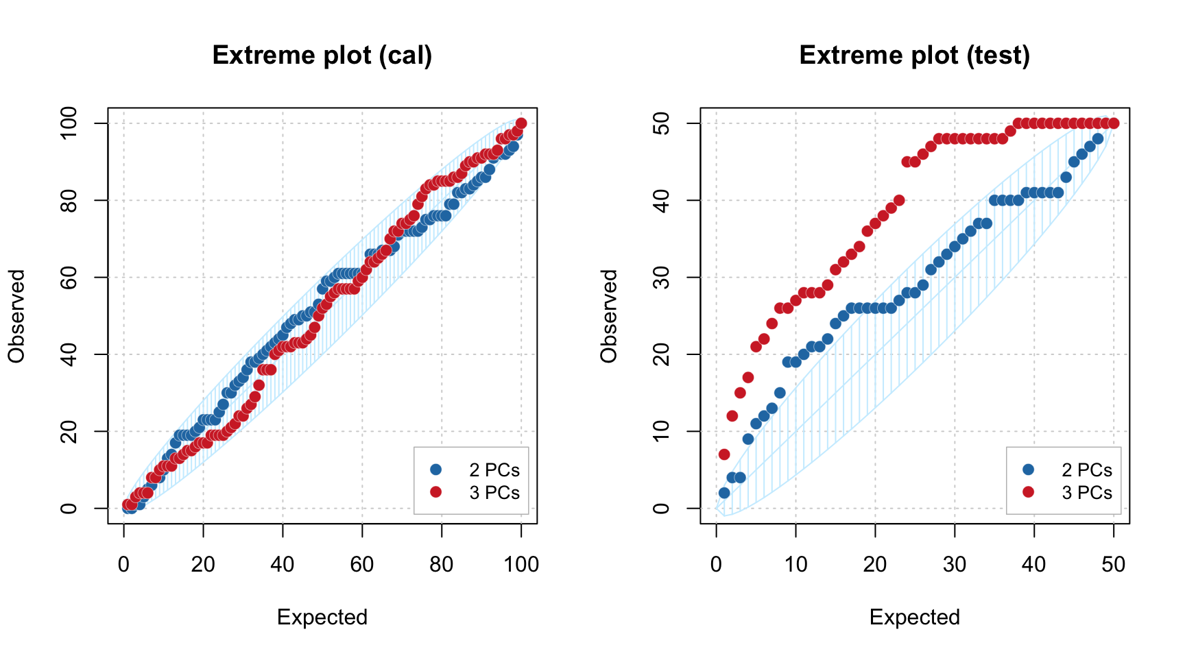 Another way to see how many components are optimal in the model, in case you have a test set or just a new set of measurements you want to use the model with, is to employ the Extreme plot. The plot shows a number of extreme values for different \(\alpha\). Imagine that you make several distance plots with different \(\alpha\) values and count how many objects model found as extremes. On the other hand you know that the expected value is \(\alpha I\). If you plot the number of extreme values vs. the expected number — this is the Extreme plot.