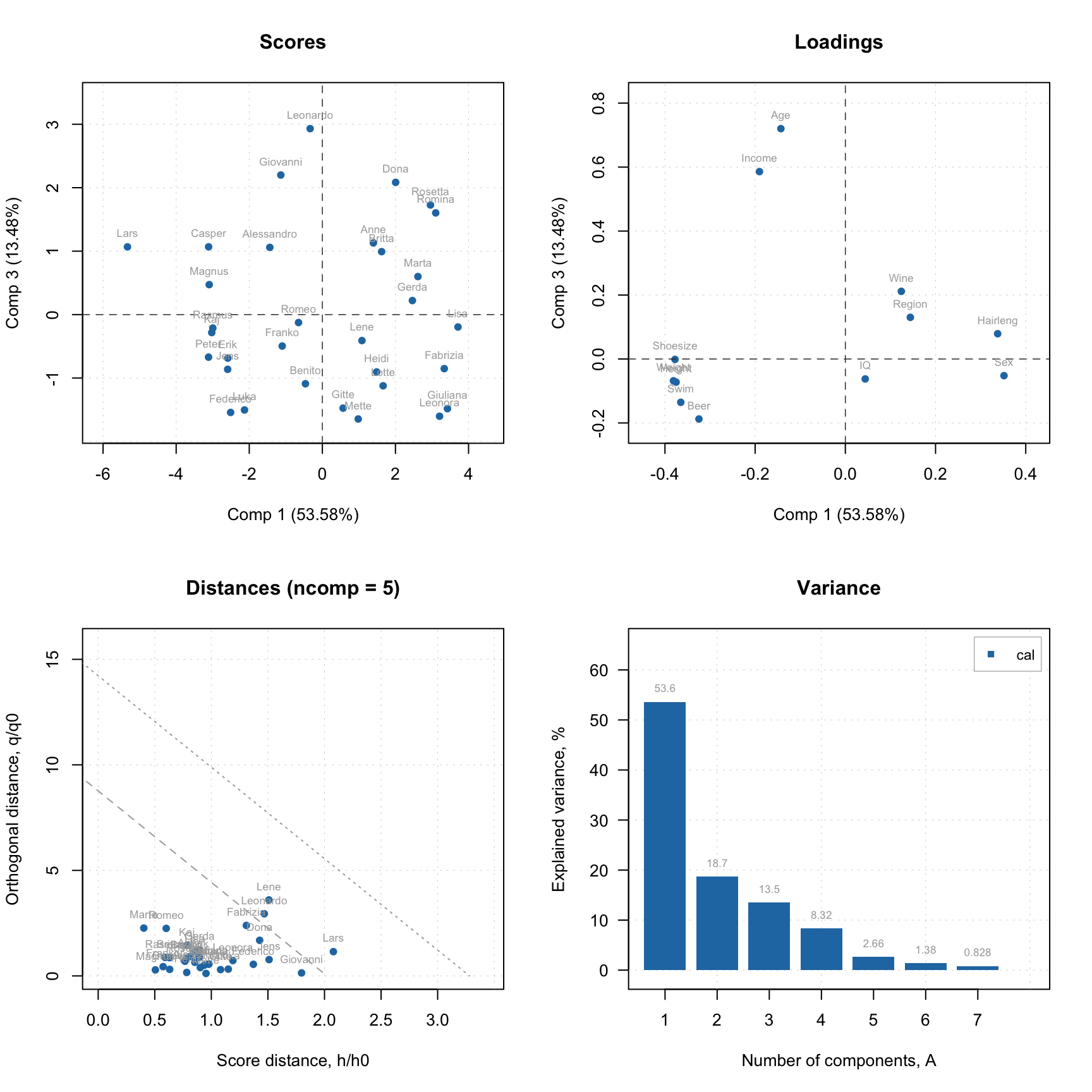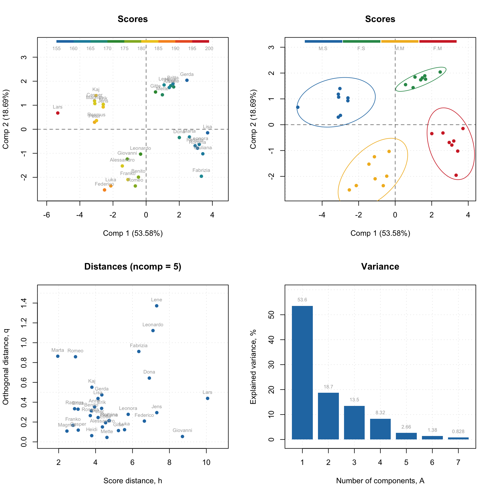 Finally, method plot() shows the four main PCA plots as a model (or results) overview.