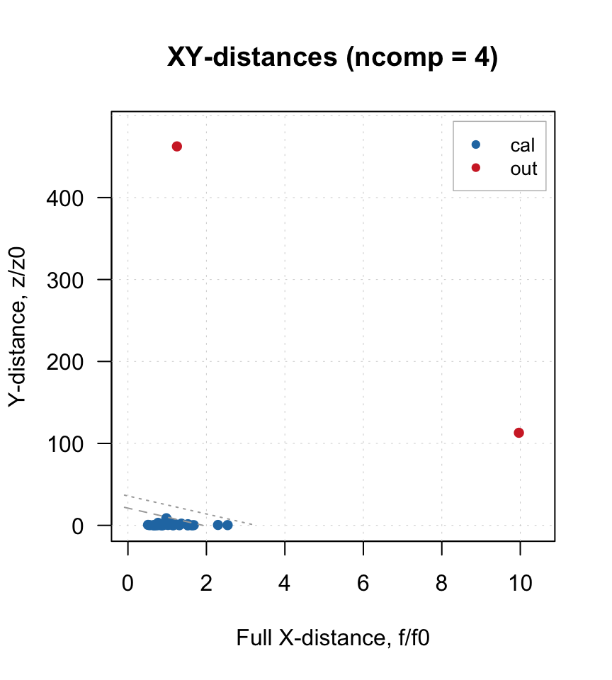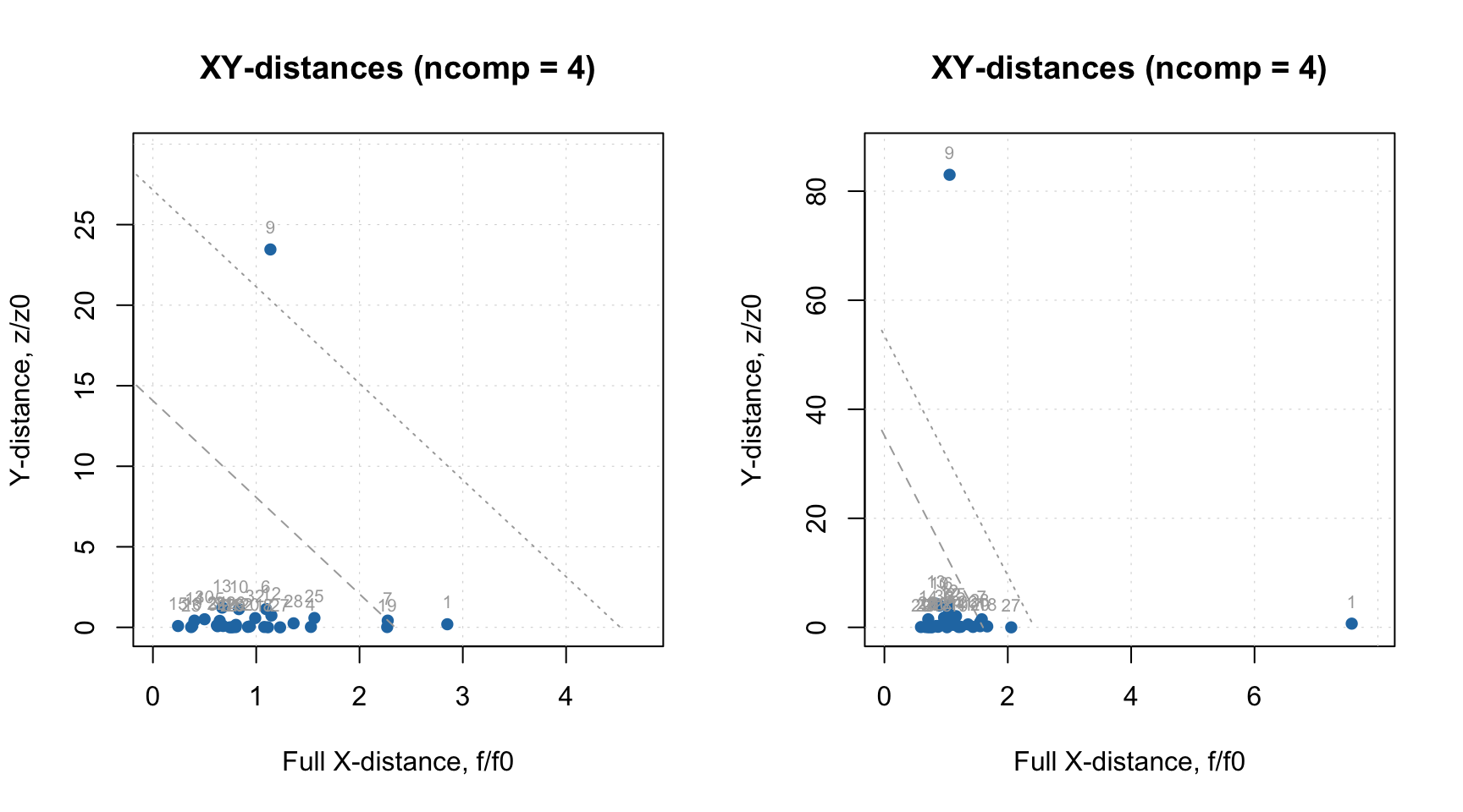Apparently four components selected automatically is indeed a proper value. The XY-distance plot shows that we have two outliers, let’s find and remove them: