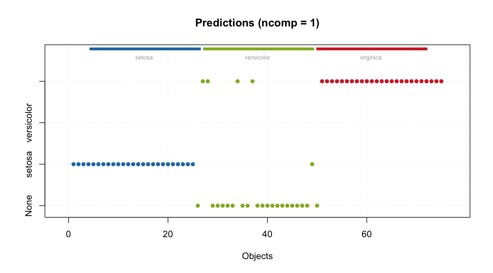 Again very similar to PLS — just use method predict() and provide at least matrix or data frame with predictors (which should contain the same number of variables/columns). For test set validation you can also provide class reference information similar to what you have used for calibration of PLS-DA models.