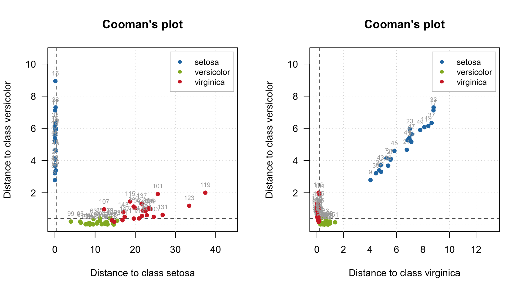 And, finally, a Cooman’s plot showing an orthogonal distance, \(q\), from objects to two selected classes/models.